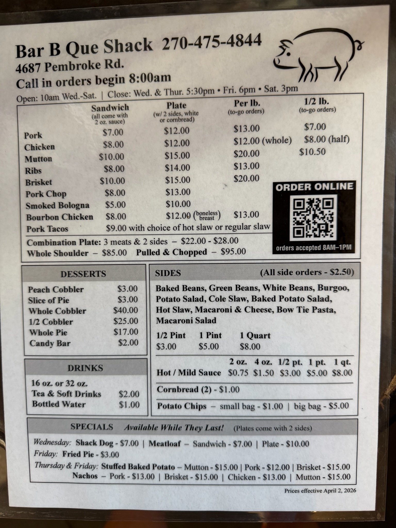 Online Order available 8am to 1pm